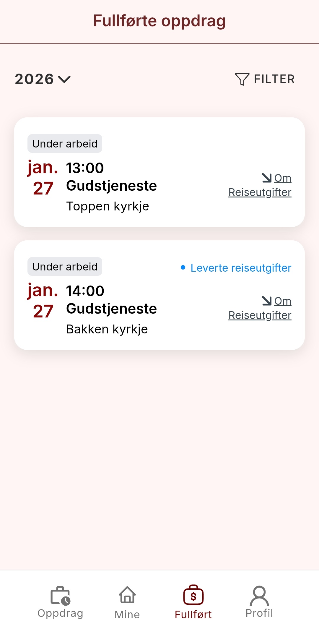 Det er mulig å filtrere på ulike statuser og bare vise oppdrag som ikke er utbetalt osv. Det er også mulig å vise oppdrag fra tidligere år ved å velge et annet årstall øverst på siden.