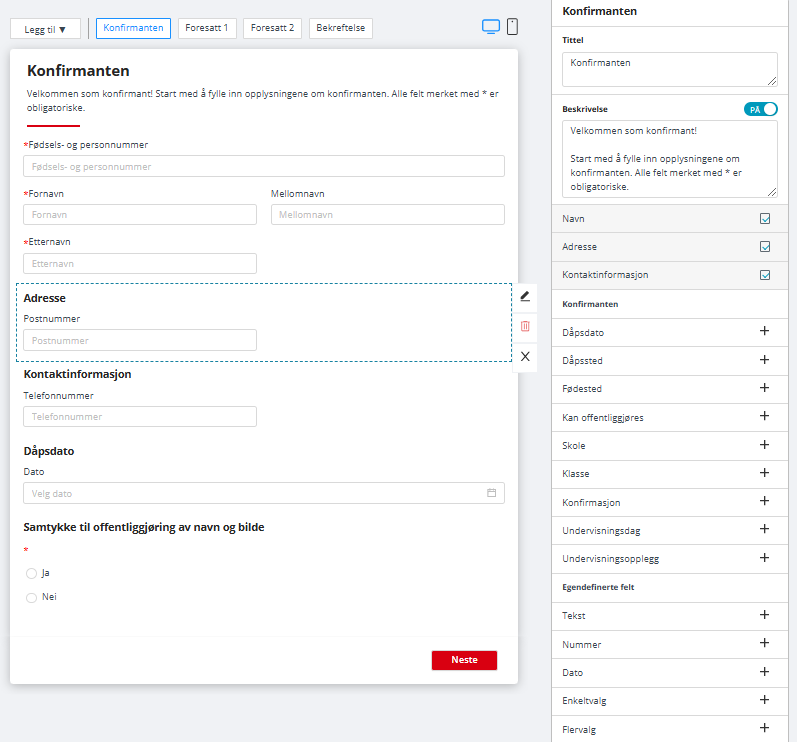 - Forhåndsdefinerte seksjoner relatert til konfirmanten
