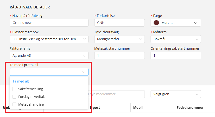 Protokoll inneholder vedtak fra alle møtesaker. Ønsker du å ha med saksfremstilling, forslag til vedtak og/eller møtebehandling huker du av for dette i innstillinger på rådet.