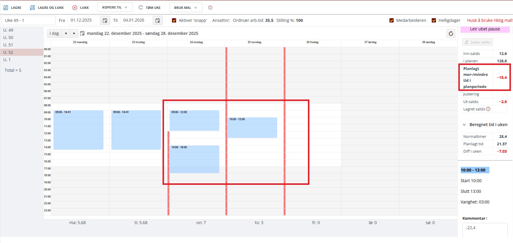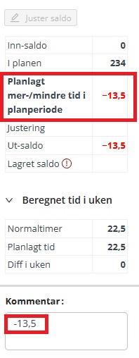Dersom det planlegges så mye arbeid på de røde dagene at "Planlagt mer-/mindre tid i planperiode" blir positiv, må dette justeres ved å ta bort arbeidstid på andre dager i planen.
