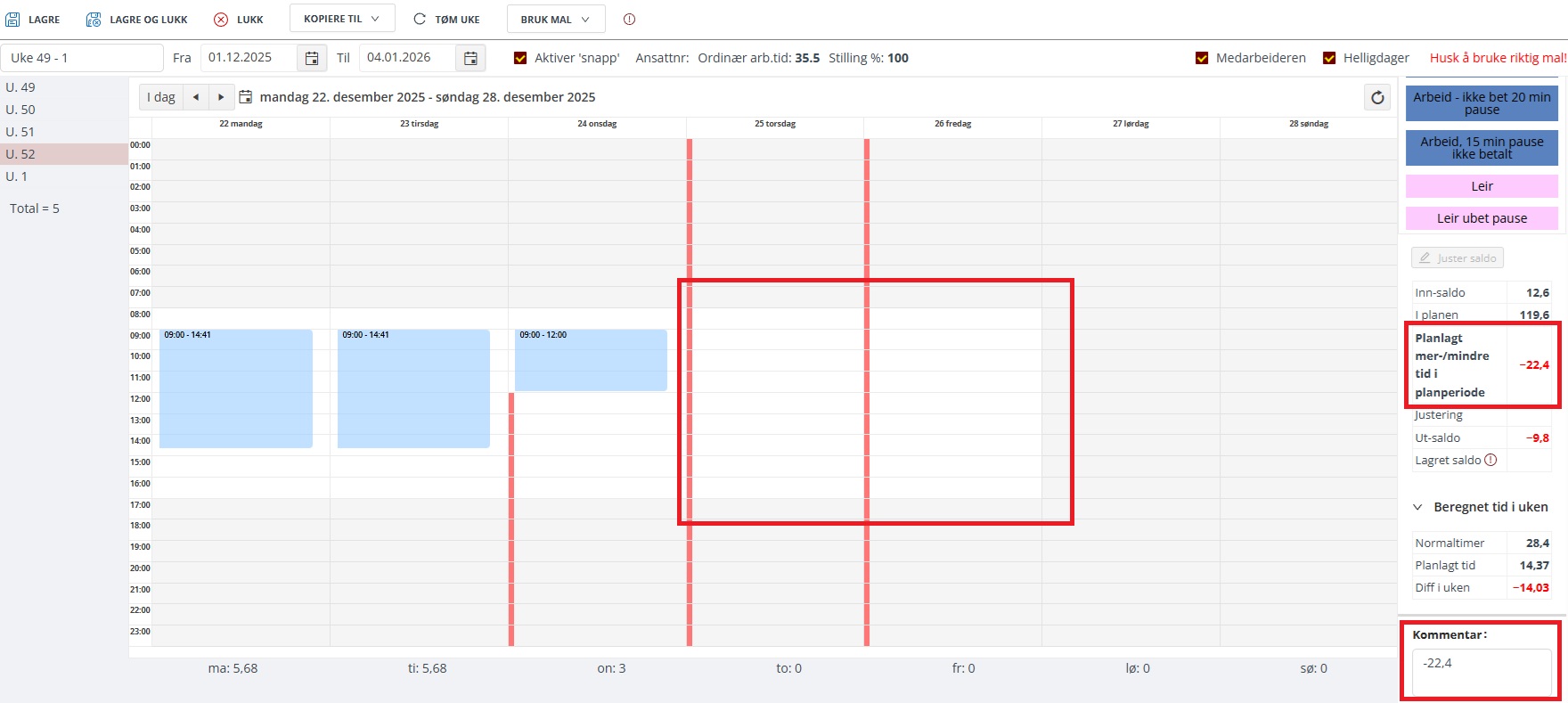 Når det da lages et skjemaforslag og velges en mal, vil det dersom det er røde dager/helligdager i perioden bli forventet arbeid også på røde dager. Men det legges ikke inn arbeidstid fra malen på disse dagene. Dette resulterer i et negativt tall for «Planlagt mer-/mindretid i planperiode», og dette tallet må tas vare på til bruk senere i prosessen. Det kan f.eks. legges i kommentar-feltet: