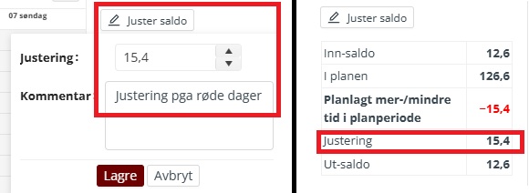 Det finnes en tilsvarende knapp for justering av fleks-saldo/tids-saldo når man går til Planlegging -> Timeregistrering.
