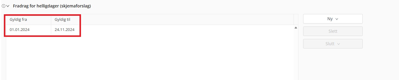 Ansatte som forventes å arbeide på røde dager (har tjeneste ved arrangementer som foregår på røde dager), skal ikke ha innstillingen Fradrag for helligdager (skjemaforslag). Dette settes ved å enten avslutte (Slutt) eller slette (Slett) linja under Fradrag for helligdager (skjemaforslag) i Innstillinger på den enkelte ansatte: