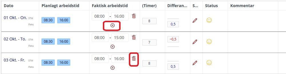 Selve redigeringen skjer på samme måte som før ved å klikke på + for å legge til ny faktisk arbeidstid på en dag, og det kan fortsatt legges til flere arbeidsperioder i løpet av en dag ved å klikke på + flere ganger. Klikk på søppelbøtta etter registrert arbeidstid for å slette den registrerte arbeidstiden på en dag.