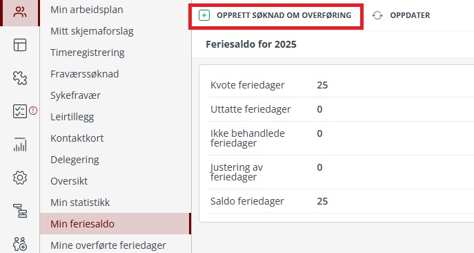 Under Min side finnes det nå en visning av Min feriesaldo. Denne viser hvor mange feriedager som er tilgjengelige i år, hvor mange dager som er brukt og hvor mange feriedager som gjenstår. Her er det nå også en mulighet for å søke om å overføre feriedager til neste år. Det er bare mulig å overføre gjenstående feriedager og aldri mer enn 10 dager. For å søke om overføring av ferie, klikk på Opprett søknad om overføring av ferie øverst i bildet: