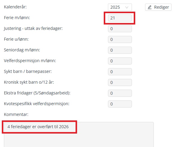 Når overføring av feriedager er godkjent, oppdateres antall tilgjengelige feriedager i oversikten på Kontaktkortet samtidig som det legges inn en kommentar som sier hvor mange feriedager som er overført:
