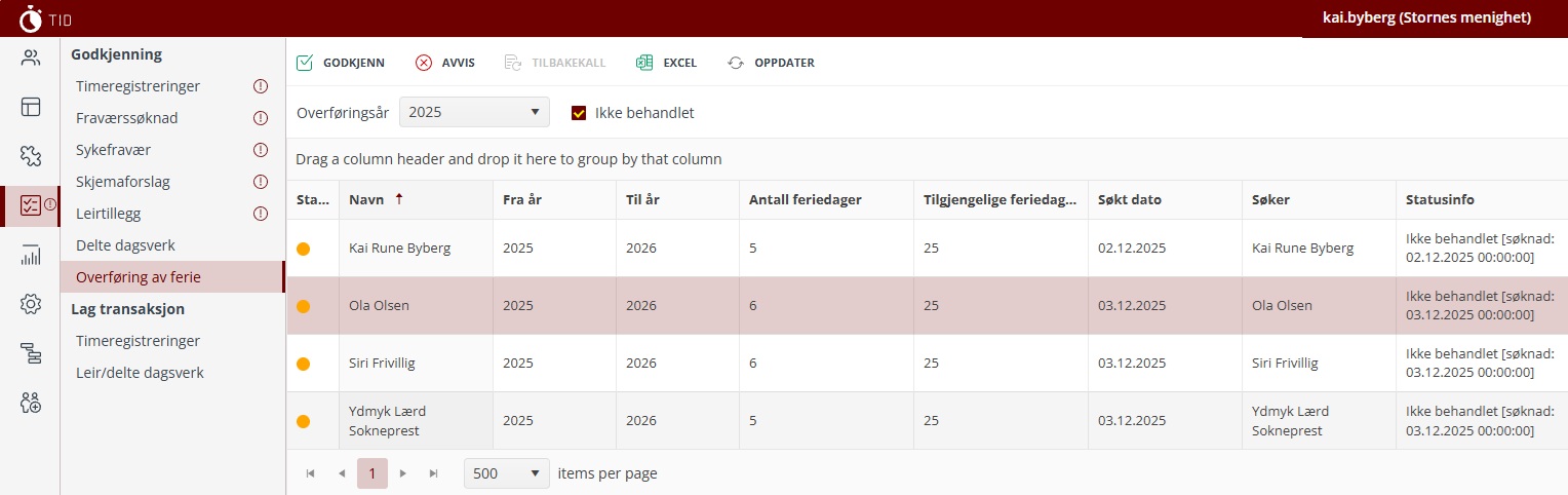 For godkjenning av overføring av ferie finnes det nå et nytt menypunkt under Godkjenning som viser søknader som er sendt inn om overføring av ferie der disse kan godkjennes eller avslås.