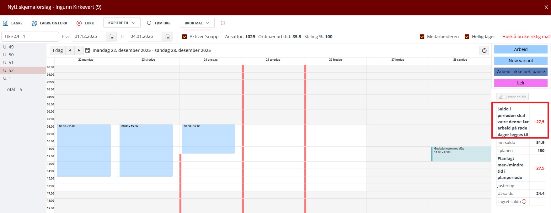 For ansatte uten fradrag for røde dager lagres nå startsaldoen i skjemaforslaget etter at riktig mal er valgt. Dette for å ha dette tallet tilgjengelig under planleggingen siden dette er summen det skal planlegges til før det legges til arbeid på røde dager.