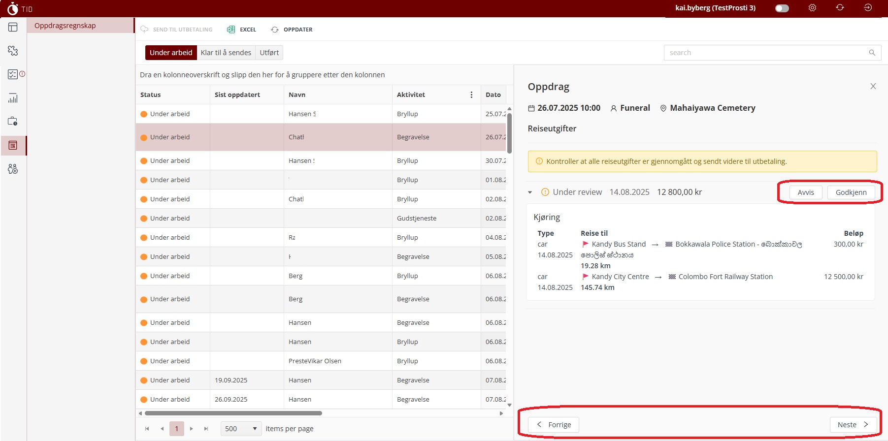 Oppdrag "Under arbeid" må godkjennes i lønnsmodulen før utbetaling. Det tas ikke stilling til selve oppdraget. Når oppdraget er godkjent av prost/prostesekretær er det godkjent, men reiseregning må godkjennes.