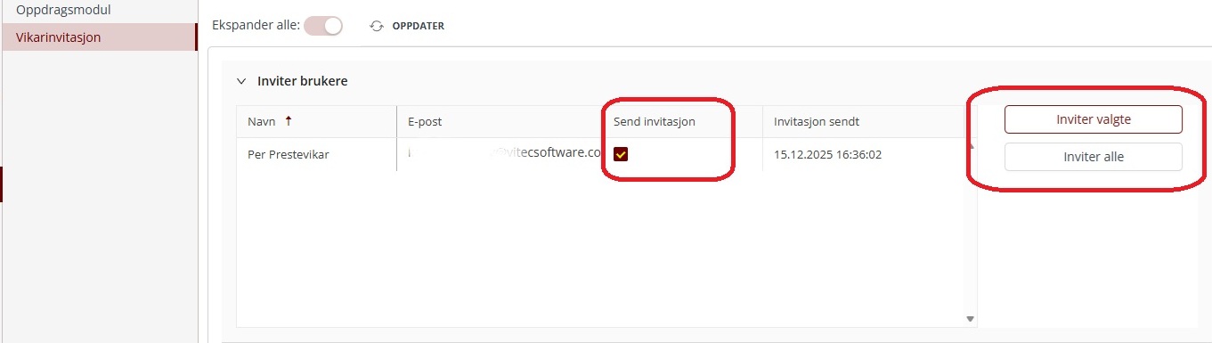 Vikarer i oppdragsmodulen blir overført fra SD Worx med brukertilgangen Vikar. Disse vikarene vil bli tilgjengelige i vinduet Inviter brukere under Vikarinvitasjonmenyen. For å invitere en vikar, merk denne i Send invitasjon-kolonnen og klikk på Inviter valgte-knappen til høyre. For å invitere alle, klikk på Inviter alle-knappen uten å markere noen av vikarene.