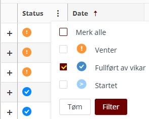 Det er mulig å filtrere på status ved å klikke de tre prikkene ved Status og krysse av for status som ønskes vist.