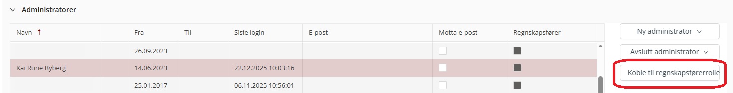 Den ansatte som får tilgang blir markert i kolonnen Regnskapsfører.