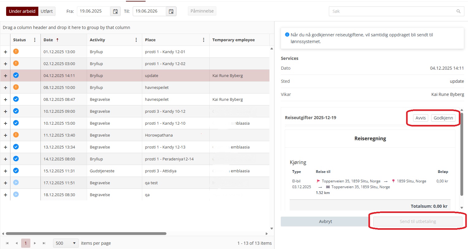 Ved å klikke på et oppdrag som er fullført, kommer mer informasjon om oppdraget og evt. reiseregning i et vindu til høyre med mulighet for å godkjenne og sende oppdraget videre til utbetaling: